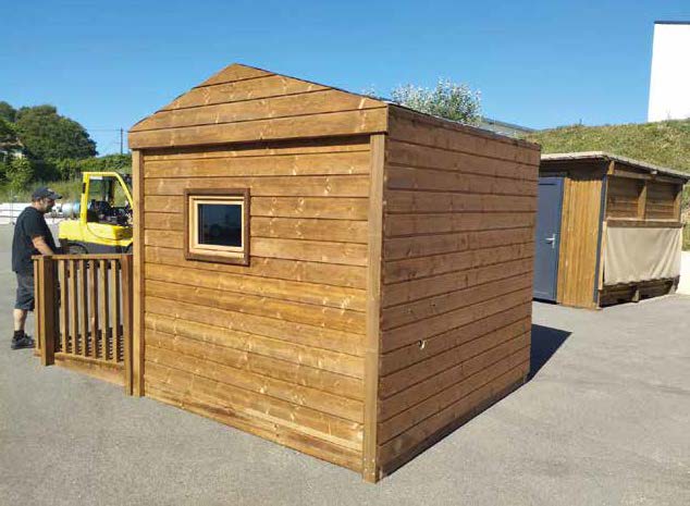 Sa structure bois renforcée, associée à des équipements robustes et durables, permet une installation fiable en extérieur, tout en conservant une intégration esthétique dans l’environnement.